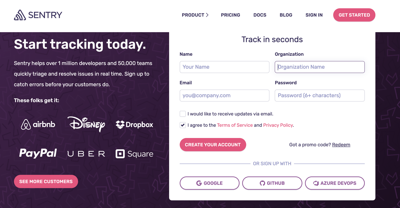 Sentry는 어플리케이션에서 오류가 발생하면 알려주는 강력한 에러 트래킹 서비스이다. 로그에 대한 다양한 정보를 제공하고 얼마나 많은 이벤트가 발생했는지 알 수 있다. 클라이언트의 오류 발생시 메일을 보내주고, 슬랙과 연동하면 슬랙 메시지를 통해 오류 발생과 해당 오류에 대한 정보 파악이 가능하다.