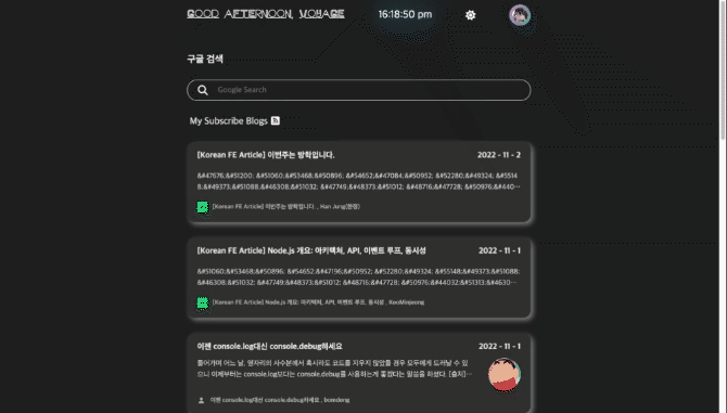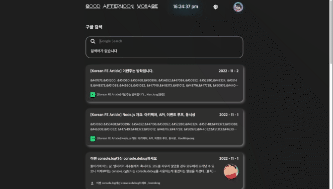 구글 검색 기능을 구현했다. 디바운스로 입력 값이 일정 시간이 지나면 구글 추천 검색어를 받아와서 보여지게 만들었으며 해당 추천 단어 클릭 혹은 입력값을 엔터키를 누르면 새창으로 구글 검색된 결과로 넘어가게 만들었다.