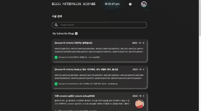 최근에 나온 글 순으로 최대한 깔끔하게 컴포넌트로 10개씩 나오게 구현했다. 구독 블로그들이 많으면 많을수록 데이터 양은 어마어마 해 지기 때문에 총 받아온 데이터 중에 100개의 데이터만 가공해서 페이지네이션으로 10개씩 추려서 보여지게 만들었다. 또한, 3시간 단위로 자동으로 업데이트 해 주는 github/workflows를 설정했기 때문에 매번 deploy할 필요가 없다.
