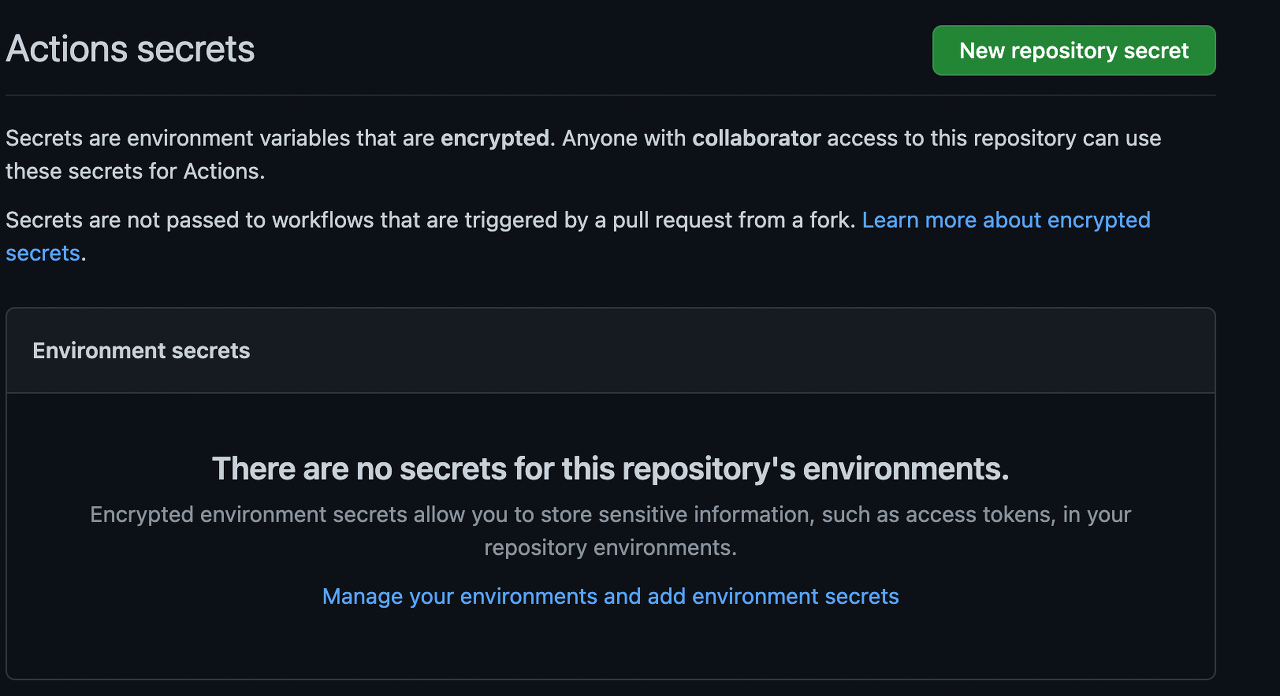 Github Repository의 Secrets은 환경 변수를 암호화해서 저장할 수 있는 기능이다. 해당 기능은 Actions를 트리거할 때, 환경 변수를 가져오기 위해 사용할 수 있다. 즉, 로컬 개발 환경에서는 .env 파일을 통해 환경 변수에 접근하고, 배포할 때에는 actions secrets을 통해 환경 변수에 접근할 수 있다.