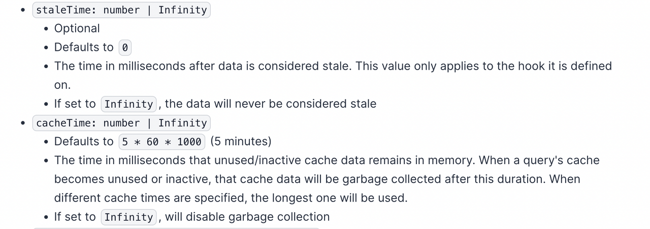 - 전달받은 데이터는 리액트 쿼리의 자료구조 내용 중 캐시에 저장이 되는데, 이때 이 캐시데이터의 stale 즉, “신선한 상태” 가 언제까지 유지할지를 말해주는 옵션이다. 기본 default 값은 0으로, 받아오는 즉시 stale 하다고 판단하며 캐싱 데이터와 무관하게 계속해서 fetching을 진행한다.