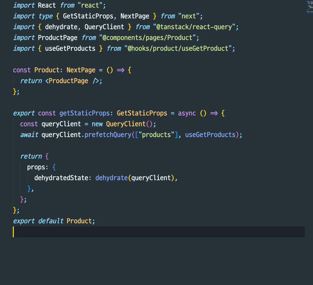 QueryClient 클래스를 이용해 queryClient 인스턴스를 생성한 후에 prefetchQuery 메서드를 호출했다. 그리고 해당 인스턴스를 dehydrate해서 props로 전달한다. 이후 queryClient는 hydration 과정에서 hydrate되어 클라이언트 측에서 사용 가능하다. 즉, 미리 fetch받을때 사용했던 쿼리 키를 가지고 프론트 측에서 동일한 키로 데이터를 불러오는 것이 가능하다.