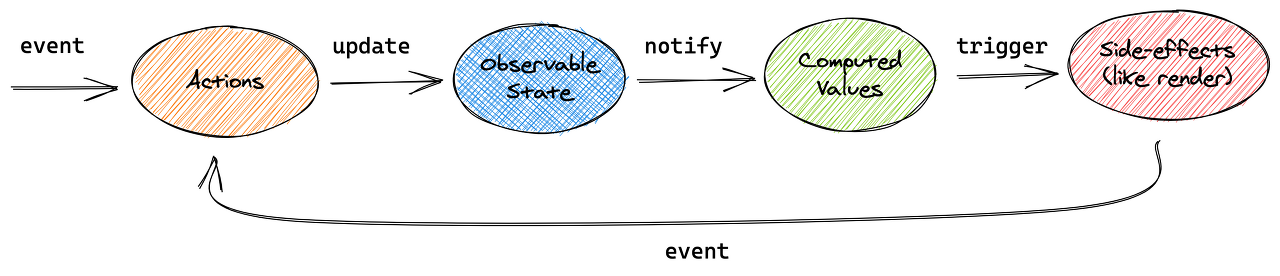 mobX의 공식문서를 참고해보면 mobX는 다음과 같은 구조로 되어있다.