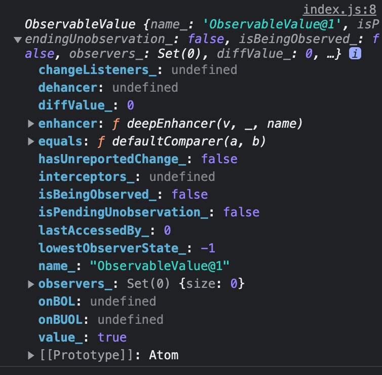 observableValue라고 하는 객체가 나온다. 타이밍 상 보면은 observable이 먼저 실행되고 autorun이 실행되는걸 볼 수 있다. autorun이라는 부분은 최초에 설정될때 초기값들로 안에 있는 함수가 실행이 되는걸 알 수 있다.