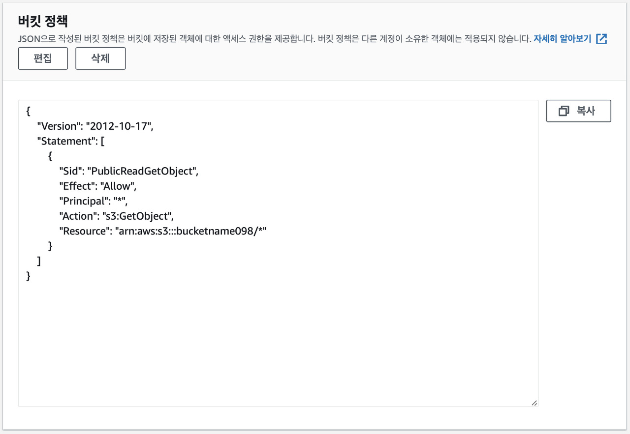 - 권한 > 버킷 정책 수정