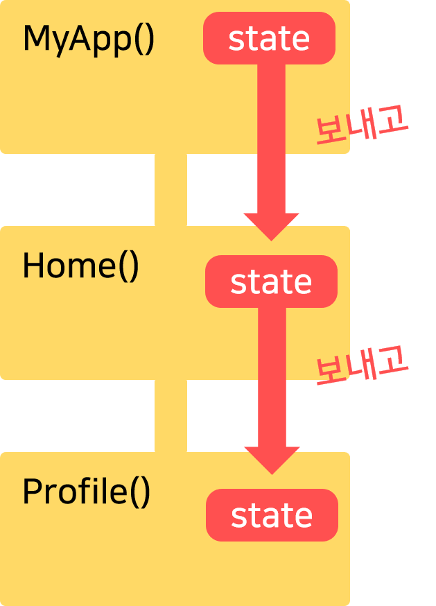 만약에 부모 커스텀 위젯에 있던 state를 자식 커스텀 위젯으로 보내고 싶으면 3-step으로 보내야 한다. 하지만 부모 → 자식이 아니라 부모 → 자식 → 손자 위젯으로 보내고 싶으면 어떻게 할까?