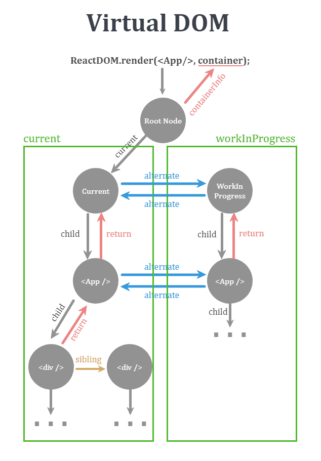 따라서 리액트 Virtual DOM은 그림과 같이 두개의 트리 추상화 하여 관리한다. **current는 현재 상태가 반영된 트리, workInProgress는 작업을 진행 중인 트리**를 의미.