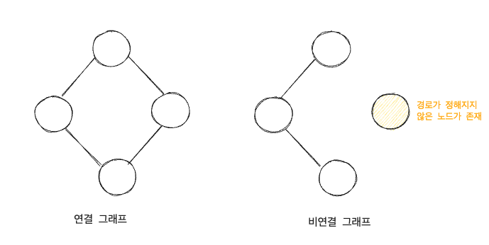 - 특정 노드에 대한 경로가 하나라도 존재하지 않을 경우 비연결 그래프