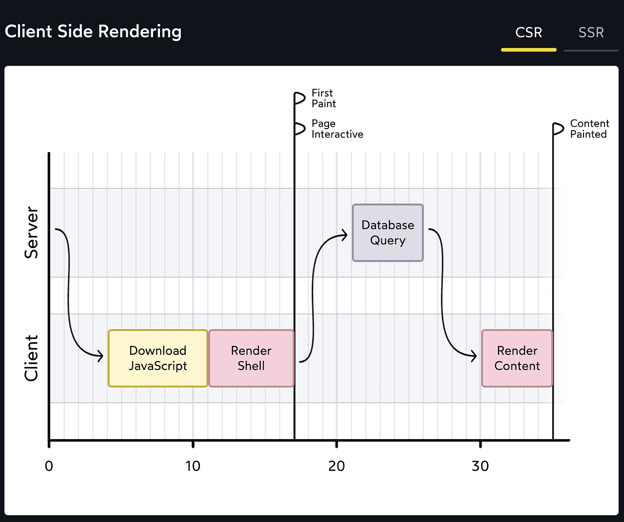 | Time To First Byte(TTFB) | 빠름(빈 페이지 응답) | 느림(렌더링 후 응답) |