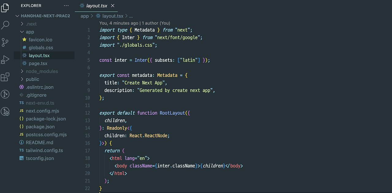 create-next-app로 우리가 보일러 플레이트로 프로젝트를 생성했을 때 기본으로 만들어지는 파일 중에 하나이다. 이 파일의 목적은 페이지의 레이아웃을 구성하는 요소로서 역할을 하고 있다. 즉, 어떤 폴더에 app 이라는 디렉터리가 있는데 이 폴더에 레이아웃이 있다면 이 레이아웃은 이 폴더 그리고 이 폴더의 하위 주소에 모두 영향을 미친다.