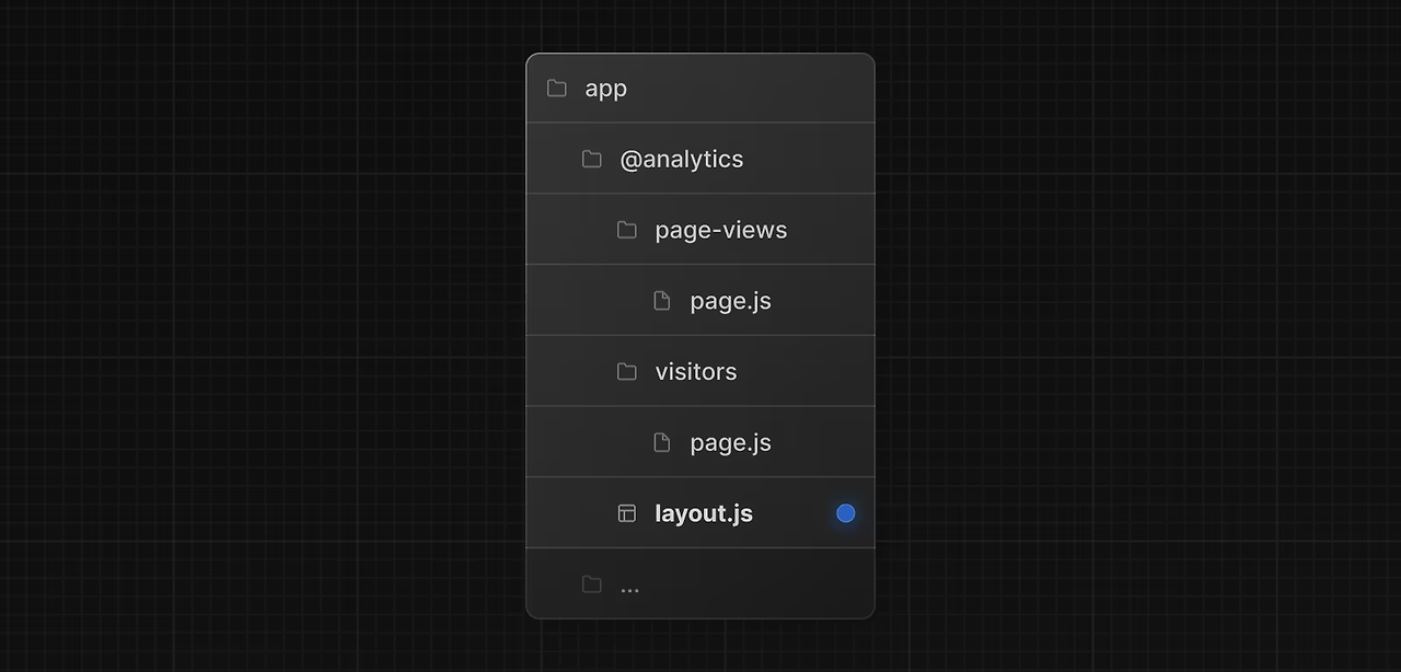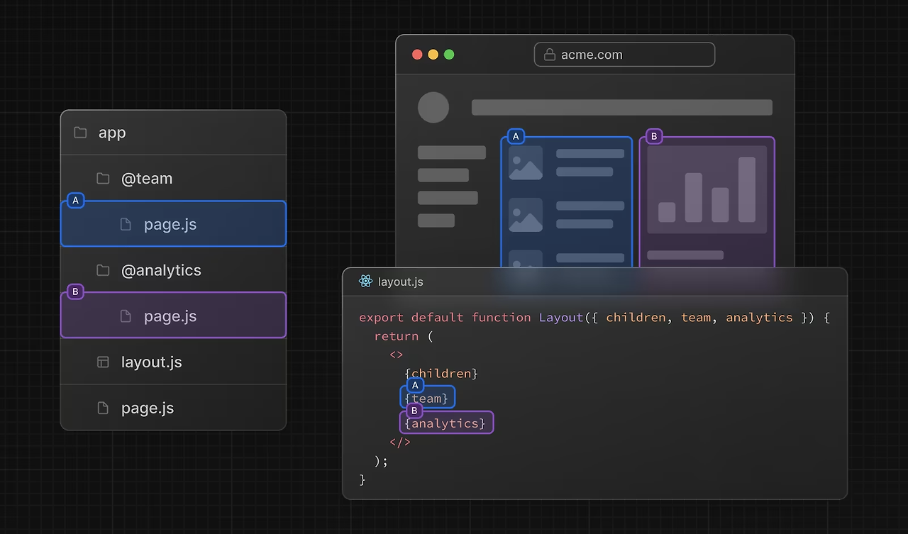 이렇게 앱 디렉토리 하위에서 @team 이라는 이름의 병렬 라우트 슬롯 그리고 @analytics라는 슬롯을 만들고 둘 다 이렇게 페이지라는 이름으로 페이지 컴포넌트를 만들었을 때 이 요소들을 다음과 같이 레이아웃에서 두 개를 동시에 보여주는 병렬 라우팅을 처리를 할 수가 있다.