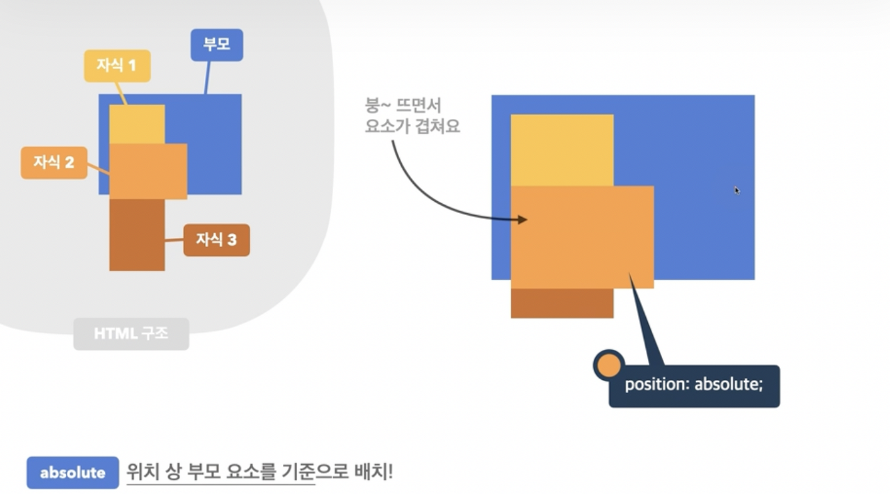 - !! Position 속성인 absolute 키워드를 적용하면 부모 태그가 영역을 차지하지 X, 따라서 자손의 position 속성에 absolute 키워드를 적용할 때는 태그에 몇 가지 처리를 해야된다