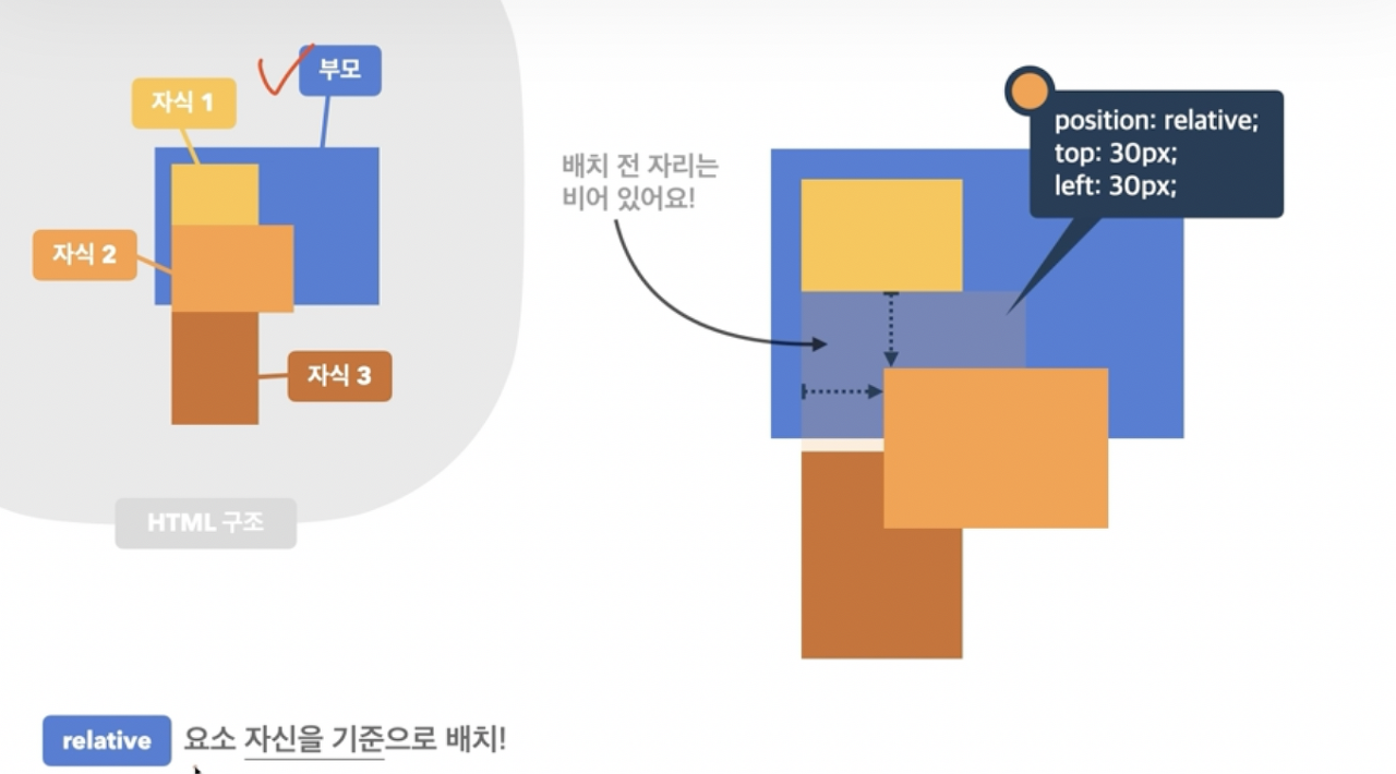 - 자손의 position 속성에 absoulte 키워드를 적용하려면 부모의 position 속성에 relative 키워드를 적용