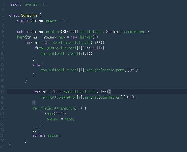 -> 참여자와 완주자를 비교해서 완주를 못한 참여자를 뽑아내야 되므로 Map으로 각 참여자와 완주자를 Key값으로 만들기 위해 Map을 사용