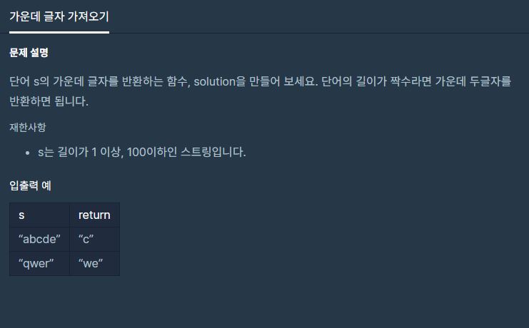 - 홀수라면 2로 나누어서 가운데 글자를 가져온다